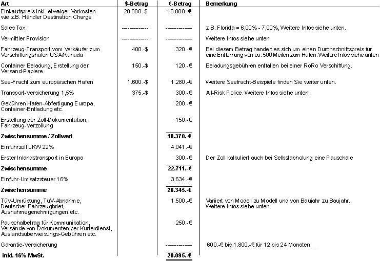 Beispiel 2: Pickup Doppelkabine Long Box • Einkaufspreis 20.000.-$ • Dollarkurs 1,25$ |