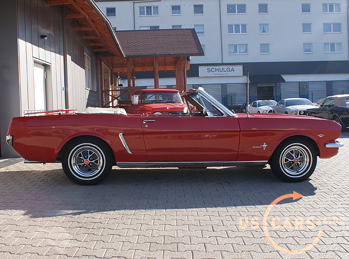 289er 4.7L V8 Motor mit 4-Gang Schaltgetriebe, GT Styled Steel Wheels mit neuer Weisswand Bereifung, Elektrisches Cabrio Verdeck, Cabrio Persenning weiss, Original Mittelkonsole, Neue Pony Leder Innen-Ausstattung in zweifarbig Rot-Weiss, Sicherheitsgurte vorne und hinten, Aussenspiegel auf Fahrer- und Beifahrerseite, Gepäckträger auf Heckklappe, Chrom Luftfilter etc.
