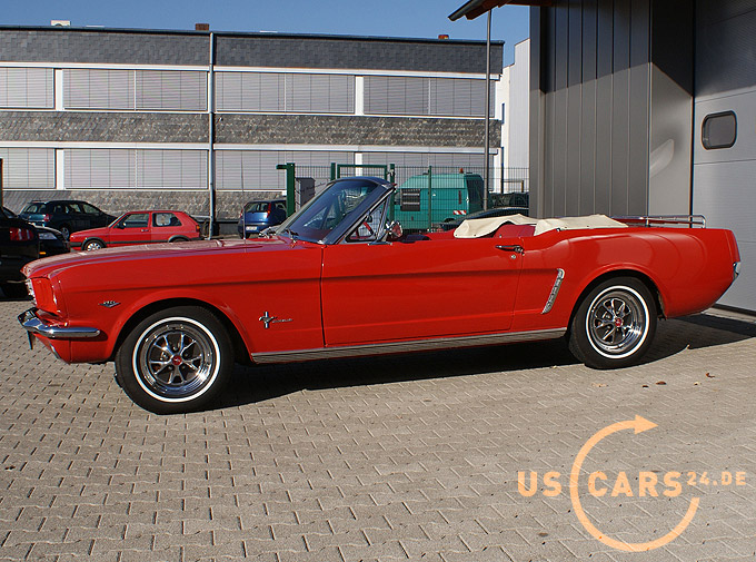 289er 4.7L V8 Motor mit 4-Gang Schaltgetriebe, GT Styled Steel Wheels mit neuer Weisswand Bereifung, Elektrisches Cabrio Verdeck, Cabrio Persenning weiss, Original Mittelkonsole, Neue Pony Leder Innen-Ausstattung in zweifarbig Rot-Weiss, Sicherheitsgurte vorne und hinten, Aussenspiegel auf Fahrer- und Beifahrerseite, Gepäckträger auf Heckklappe, Chrom Luftfilter etc.