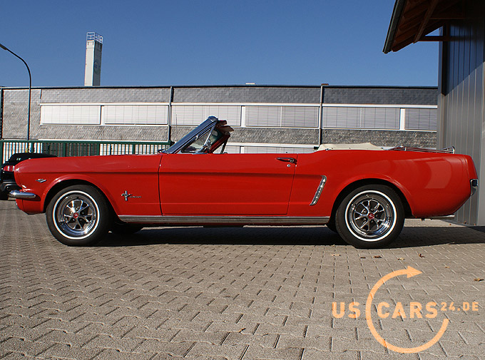289er 4.7L V8 Motor mit 4-Gang Schaltgetriebe, GT Styled Steel Wheels mit neuer Weisswand Bereifung, Elektrisches Cabrio Verdeck, Cabrio Persenning weiss, Original Mittelkonsole, Neue Pony Leder Innen-Ausstattung in zweifarbig Rot-Weiss, Sicherheitsgurte vorne und hinten, Aussenspiegel auf Fahrer- und Beifahrerseite, Gepäckträger auf Heckklappe, Chrom Luftfilter etc.