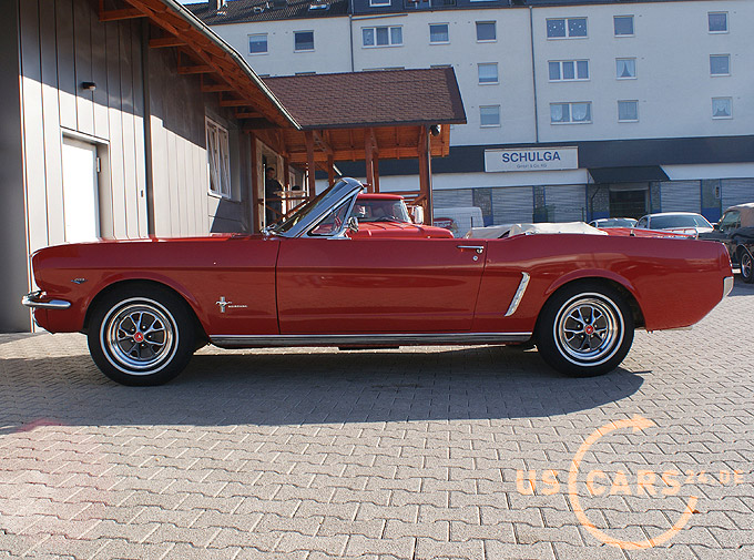 289er 4.7L V8 Motor mit 4-Gang Schaltgetriebe, GT Styled Steel Wheels mit neuer Weisswand Bereifung, Elektrisches Cabrio Verdeck, Cabrio Persenning weiss, Original Mittelkonsole, Neue Pony Leder Innen-Ausstattung in zweifarbig Rot-Weiss, Sicherheitsgurte vorne und hinten, Aussenspiegel auf Fahrer- und Beifahrerseite, Gepäckträger auf Heckklappe, Chrom Luftfilter etc.