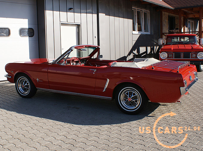 289er 4.7L V8 Motor mit 4-Gang Schaltgetriebe, GT Styled Steel Wheels mit neuer Weisswand Bereifung, Elektrisches Cabrio Verdeck, Cabrio Persenning weiss, Original Mittelkonsole, Neue Pony Leder Innen-Ausstattung in zweifarbig Rot-Weiss, Sicherheitsgurte vorne und hinten, Aussenspiegel auf Fahrer- und Beifahrerseite, Gepäckträger auf Heckklappe, Chrom Luftfilter etc.