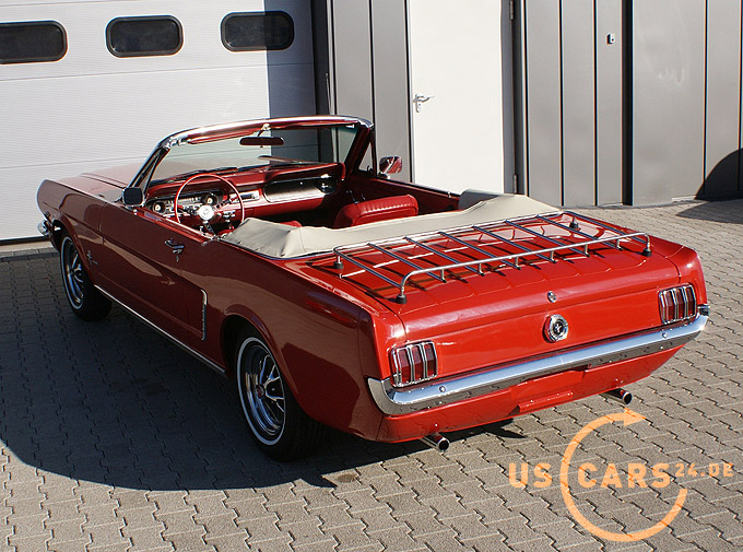 289er 4.7L V8 Motor mit 4-Gang Schaltgetriebe, GT Styled Steel Wheels mit neuer Weisswand Bereifung, Elektrisches Cabrio Verdeck, Cabrio Persenning weiss, Original Mittelkonsole, Neue Pony Leder Innen-Ausstattung in zweifarbig Rot-Weiss, Sicherheitsgurte vorne und hinten, Aussenspiegel auf Fahrer- und Beifahrerseite, Gepäckträger auf Heckklappe, Chrom Luftfilter etc.