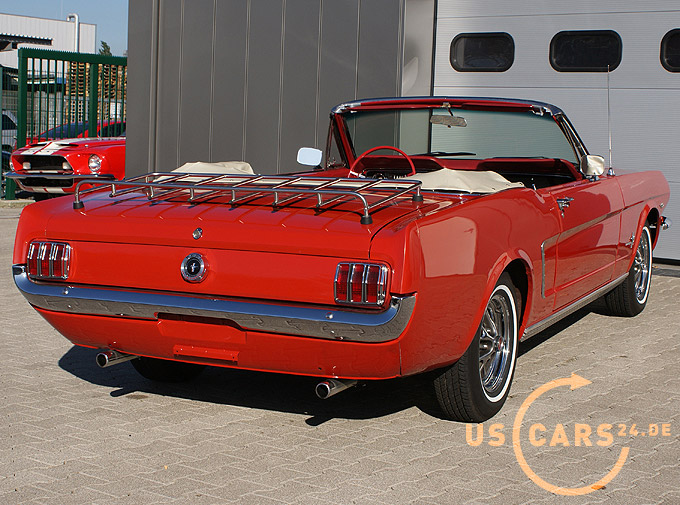 289er 4.7L V8 Motor mit 4-Gang Schaltgetriebe, GT Styled Steel Wheels mit neuer Weisswand Bereifung, Elektrisches Cabrio Verdeck, Cabrio Persenning weiss, Original Mittelkonsole, Neue Pony Leder Innen-Ausstattung in zweifarbig Rot-Weiss, Sicherheitsgurte vorne und hinten, Aussenspiegel auf Fahrer- und Beifahrerseite, Gepäckträger auf Heckklappe, Chrom Luftfilter etc.