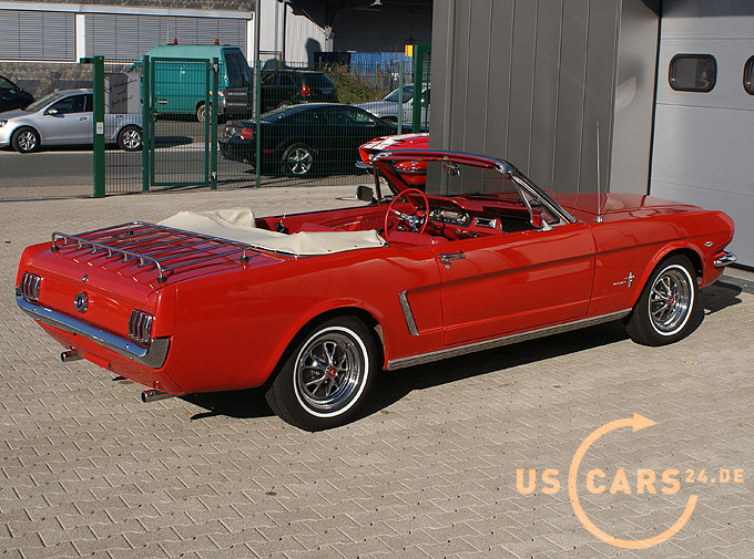 289er 4.7L V8 Motor mit 4-Gang Schaltgetriebe, GT Styled Steel Wheels mit neuer Weisswand Bereifung, Elektrisches Cabrio Verdeck, Cabrio Persenning weiss, Original Mittelkonsole, Neue Pony Leder Innen-Ausstattung in zweifarbig Rot-Weiss, Sicherheitsgurte vorne und hinten, Aussenspiegel auf Fahrer- und Beifahrerseite, Gepäckträger auf Heckklappe, Chrom Luftfilter etc.