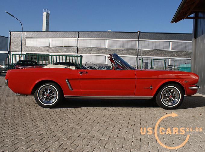 289er 4.7L V8 Motor mit 4-Gang Schaltgetriebe, GT Styled Steel Wheels mit neuer Weisswand Bereifung, Elektrisches Cabrio Verdeck, Cabrio Persenning weiss, Original Mittelkonsole, Neue Pony Leder Innen-Ausstattung in zweifarbig Rot-Weiss, Sicherheitsgurte vorne und hinten, Aussenspiegel auf Fahrer- und Beifahrerseite, Gepäckträger auf Heckklappe, Chrom Luftfilter etc.