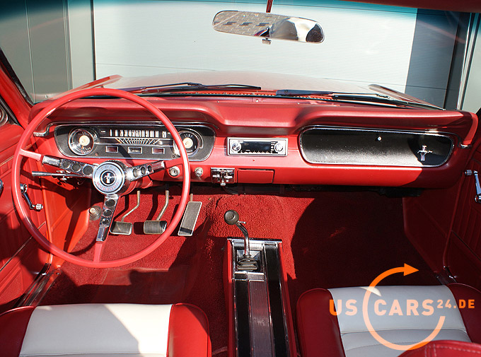 289er 4.7L V8 Motor mit 4-Gang Schaltgetriebe, GT Styled Steel Wheels mit neuer Weisswand Bereifung, Elektrisches Cabrio Verdeck, Cabrio Persenning weiss, Original Mittelkonsole, Neue Pony Leder Innen-Ausstattung in zweifarbig Rot-Weiss, Sicherheitsgurte vorne und hinten, Aussenspiegel auf Fahrer- und Beifahrerseite, Gepäckträger auf Heckklappe, Chrom Luftfilter etc.
