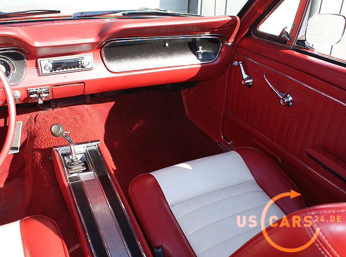 289er 4.7L V8 Motor mit 4-Gang Schaltgetriebe, GT Styled Steel Wheels mit neuer Weisswand Bereifung, Elektrisches Cabrio Verdeck, Cabrio Persenning weiss, Original Mittelkonsole, Neue Pony Leder Innen-Ausstattung in zweifarbig Rot-Weiss, Sicherheitsgurte vorne und hinten, Aussenspiegel auf Fahrer- und Beifahrerseite, Gepäckträger auf Heckklappe, Chrom Luftfilter etc.