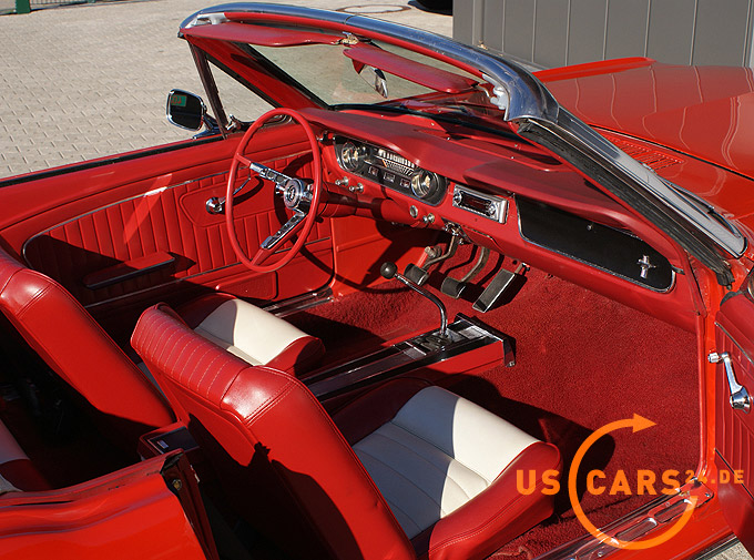289er 4.7L V8 Motor mit 4-Gang Schaltgetriebe, GT Styled Steel Wheels mit neuer Weisswand Bereifung, Elektrisches Cabrio Verdeck, Cabrio Persenning weiss, Original Mittelkonsole, Neue Pony Leder Innen-Ausstattung in zweifarbig Rot-Weiss, Sicherheitsgurte vorne und hinten, Aussenspiegel auf Fahrer- und Beifahrerseite, Gepäckträger auf Heckklappe, Chrom Luftfilter etc.