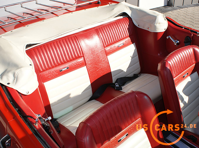 289er 4.7L V8 Motor mit 4-Gang Schaltgetriebe, GT Styled Steel Wheels mit neuer Weisswand Bereifung, Elektrisches Cabrio Verdeck, Cabrio Persenning weiss, Original Mittelkonsole, Neue Pony Leder Innen-Ausstattung in zweifarbig Rot-Weiss, Sicherheitsgurte vorne und hinten, Aussenspiegel auf Fahrer- und Beifahrerseite, Gepäckträger auf Heckklappe, Chrom Luftfilter etc.