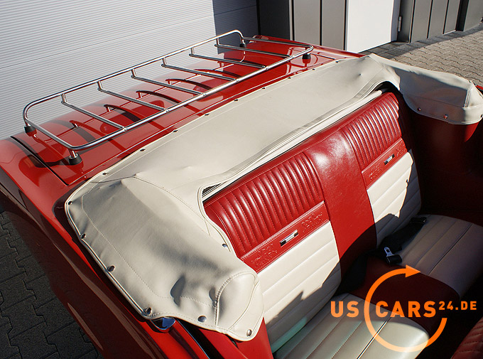 289er 4.7L V8 Motor mit 4-Gang Schaltgetriebe, GT Styled Steel Wheels mit neuer Weisswand Bereifung, Elektrisches Cabrio Verdeck, Cabrio Persenning weiss, Original Mittelkonsole, Neue Pony Leder Innen-Ausstattung in zweifarbig Rot-Weiss, Sicherheitsgurte vorne und hinten, Aussenspiegel auf Fahrer- und Beifahrerseite, Gepäckträger auf Heckklappe, Chrom Luftfilter etc.