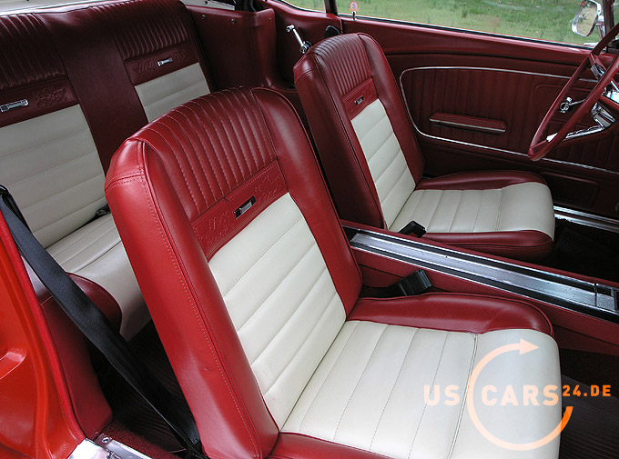 289er 4.7L V8 Motor mit 4-Gang Schaltgetriebe, GT Styled Steel Wheels mit neuer Weisswand Bereifung, Elektrisches Cabrio Verdeck, Cabrio Persenning weiss, Original Mittelkonsole, Neue Pony Leder Innen-Ausstattung in zweifarbig Rot-Weiss, Sicherheitsgurte vorne und hinten, Aussenspiegel auf Fahrer- und Beifahrerseite, Gepäckträger auf Heckklappe, Chrom Luftfilter etc.