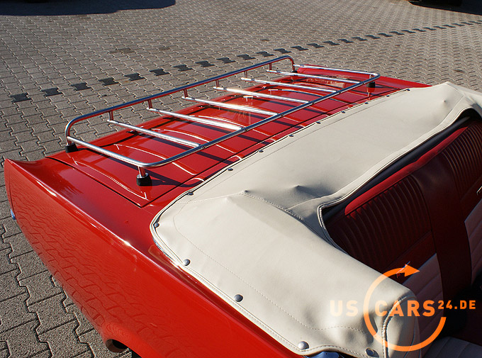 289er 4.7L V8 Motor mit 4-Gang Schaltgetriebe, GT Styled Steel Wheels mit neuer Weisswand Bereifung, Elektrisches Cabrio Verdeck, Cabrio Persenning weiss, Original Mittelkonsole, Neue Pony Leder Innen-Ausstattung in zweifarbig Rot-Weiss, Sicherheitsgurte vorne und hinten, Aussenspiegel auf Fahrer- und Beifahrerseite, Gepäckträger auf Heckklappe, Chrom Luftfilter etc.