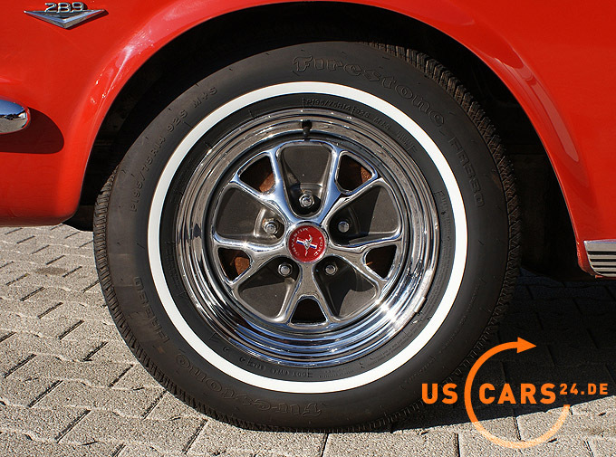 289er 4.7L V8 Motor mit 4-Gang Schaltgetriebe, GT Styled Steel Wheels mit neuer Weisswand Bereifung, Elektrisches Cabrio Verdeck, Cabrio Persenning weiss, Original Mittelkonsole, Neue Pony Leder Innen-Ausstattung in zweifarbig Rot-Weiss, Sicherheitsgurte vorne und hinten, Aussenspiegel auf Fahrer- und Beifahrerseite, Gepäckträger auf Heckklappe, Chrom Luftfilter etc.