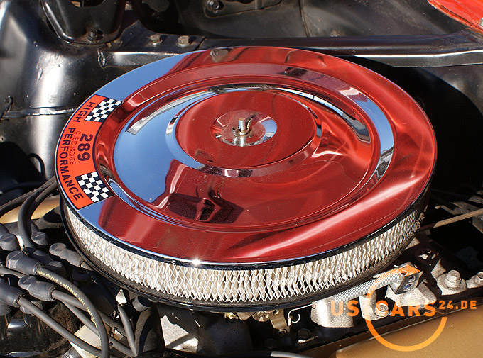 289er 4.7L V8 Motor mit 4-Gang Schaltgetriebe, GT Styled Steel Wheels mit neuer Weisswand Bereifung, Elektrisches Cabrio Verdeck, Cabrio Persenning weiss, Original Mittelkonsole, Neue Pony Leder Innen-Ausstattung in zweifarbig Rot-Weiss, Sicherheitsgurte vorne und hinten, Aussenspiegel auf Fahrer- und Beifahrerseite, Gepäckträger auf Heckklappe, Chrom Luftfilter etc.