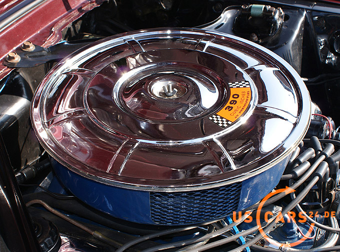390er 6.4L. V8 BIG BLOCK Motor mit Automatikgetriebe, Deluxe Ausstattung, Servo Lenkung, Elektrisches Cabrio-Verdeck, Cabrio Persenning, Volle Mittelkonsole, Gurthalter in der Mittelkonsole, Convenience Light Paket, Leder Innen-Ausstattung, Holzlenkrad, Cockpit mit 5 Armaturen, Sicherheitsgurte vorne und hinten (5 Stück), Seatbelt Anzeige, Von innen verstellbarer Aussenspiegel auf der Fahrerseite, Aluvertäfelung am Cockpit und den Türverkleidungen, Rückfahrscheinwerfer, 15 Zoll Magnum 500 Felgen mit Center Spinner und Goodyear Eagle ST Whiteletter 255/60 R15 Bereifung hinten und 215/65 R15 vorne, GT Flip Top Tankverschluss, Alu Einstiegsleisten, 9 inch Rear End, Doppel-Auspuff mit 4-fach Endstück, Chrom Luftfilter, Chrom Ventildeckel etc.